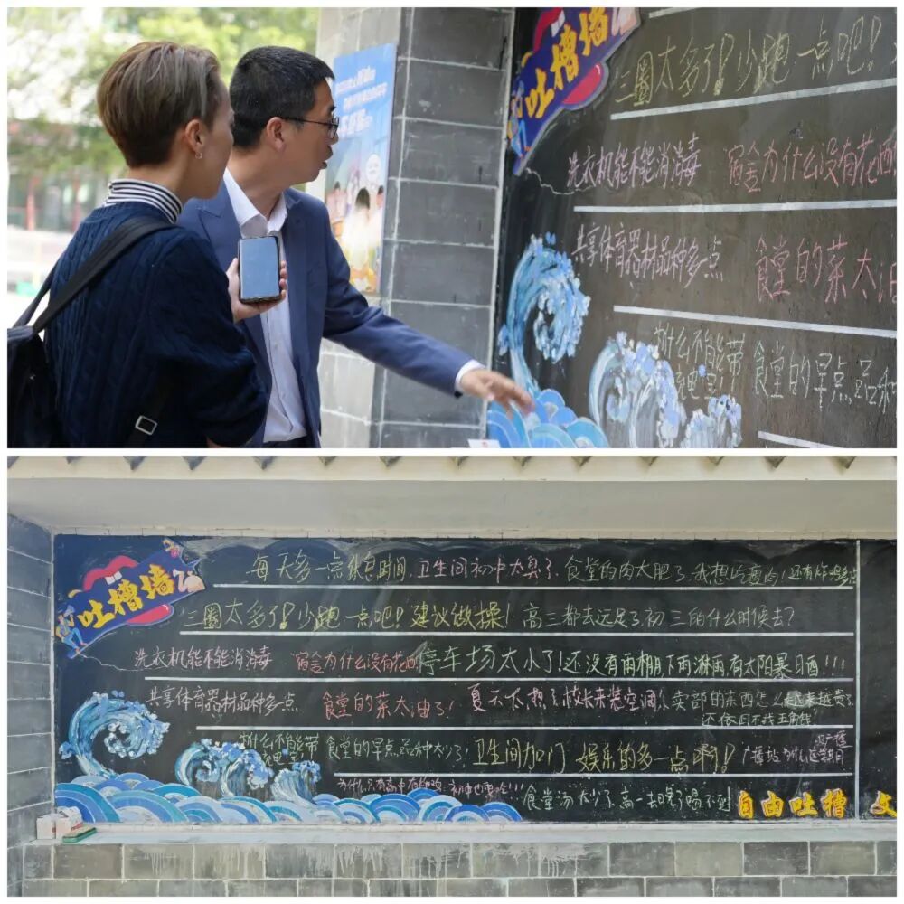 当天的升旗仪式,张敏拿着话筒,回复着“吐槽墙”上的内容,现场响起掌声、欢呼声,同学们的笑中,多了几分被理解后的轻松与释然。