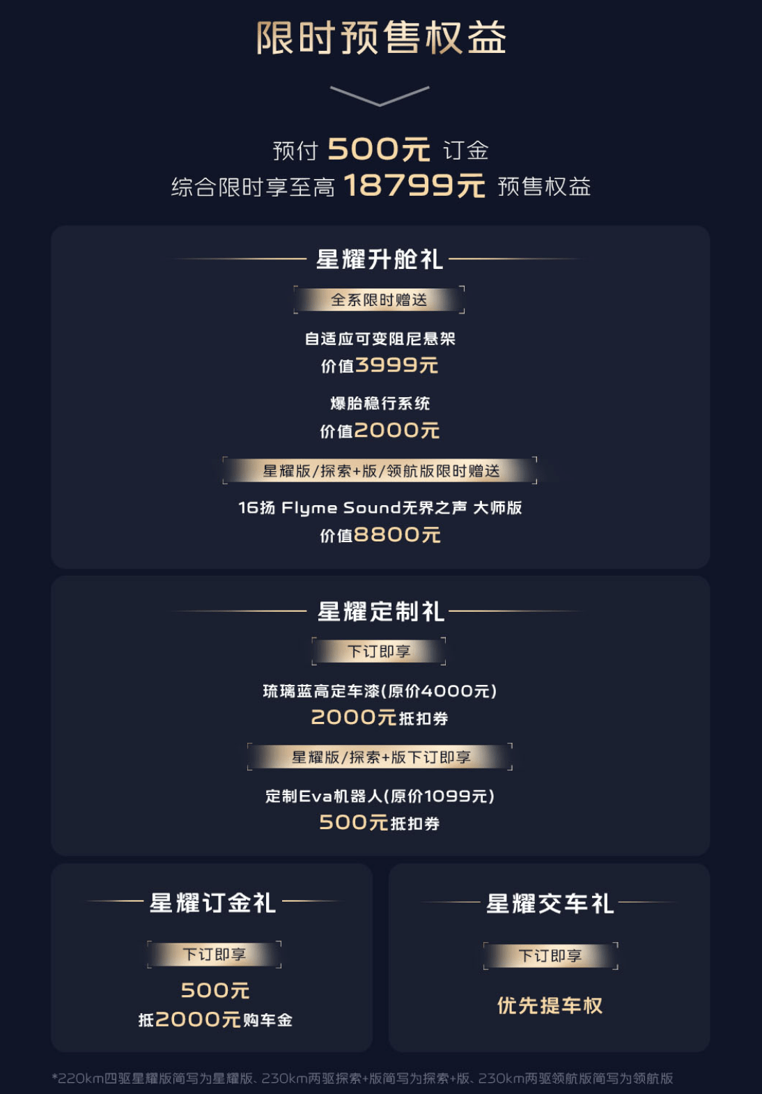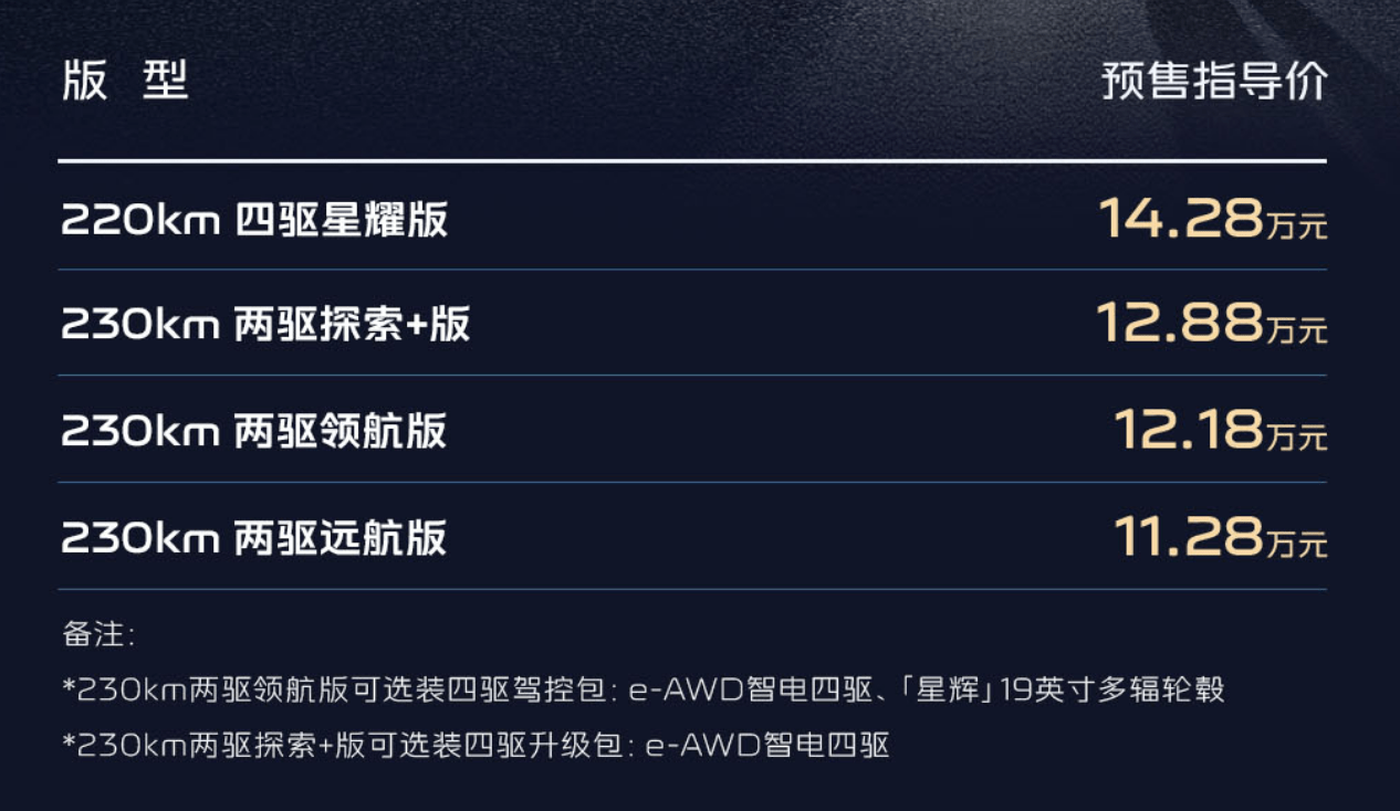 网易汽车4月16日报道 今晚,吉利银河星耀7正式开启预售,新车预售价为11.28万-14.28万,随着预售的开启,官方也带来了一系列购车权益,其中230km两驱领航版和230km两驱探索+版可选四驱升级包等,做到四驱平权。从产品定位来看,星耀7是一款主打家用的准532级别新车,但如果看到几组关键的数据,零百加速5.4秒、双电机四驱、配千里浩瀚H3智驾方案、百公里油耗2L级以及新一代豪华底盘,再加上新车所具备的高定配色以及智能座舱和满配四座按摩等功能,似乎这个预售价已然香透了。