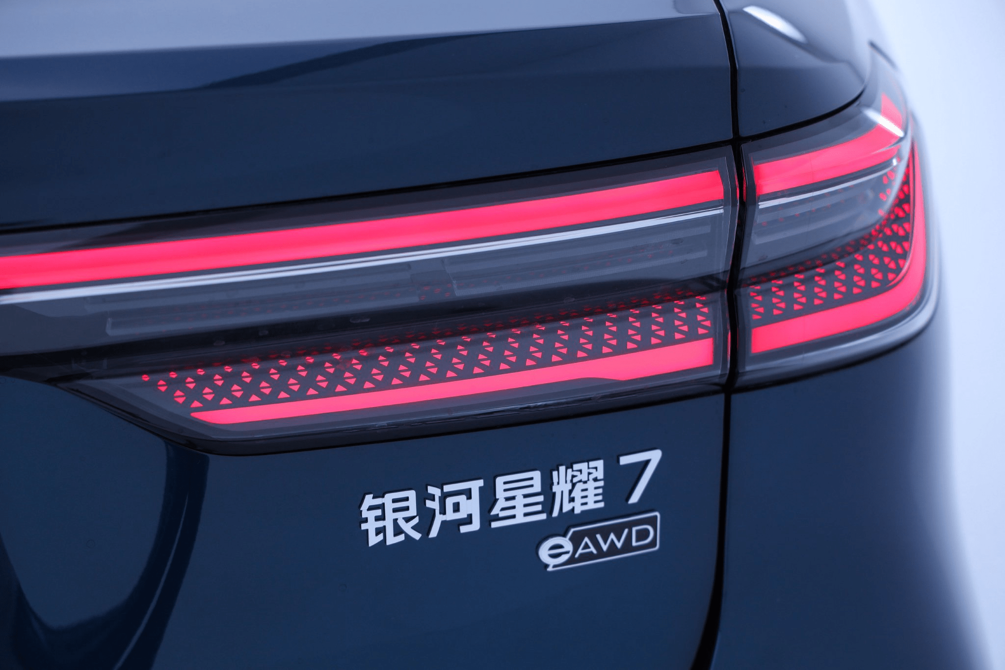 新车尾部依然是通过线条拉出的立体化型面,一体化贯穿尾灯采用384颗LED灯珠,其中超红灯珠284颗,配合同级领先0.001mm级激光镭雕工艺,精雕出832个镭雕图案,视觉效果细腻,辨识度拉满。