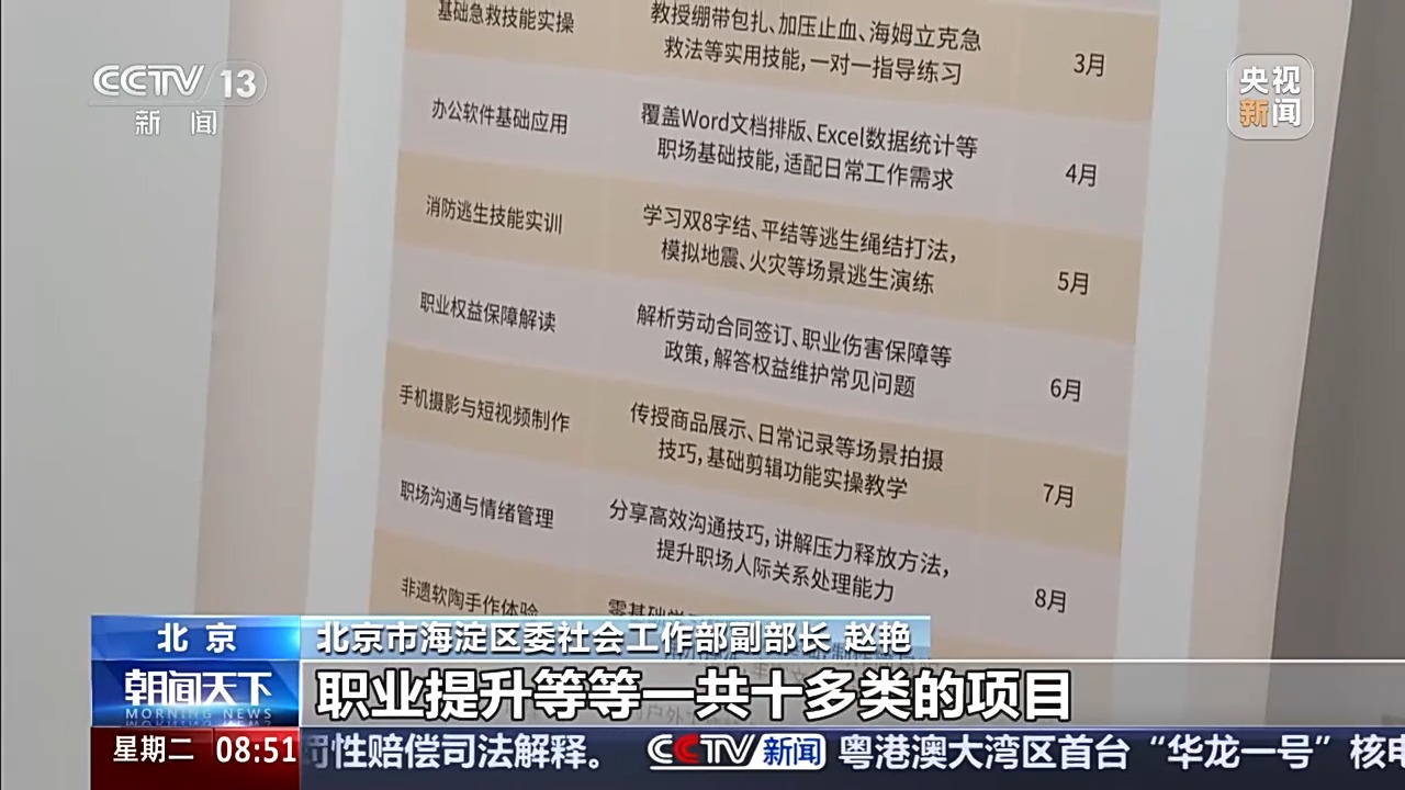 北京市海淀区委社会工作部副部长 赵艳:有法律知识、心理服务、生活技能、职业提升等一共十多类的项目,同时我们也制定出全年的学习计划表,便于他们来分配自己的学习时间。